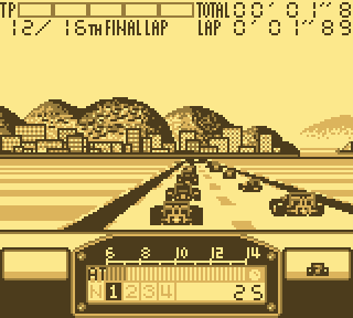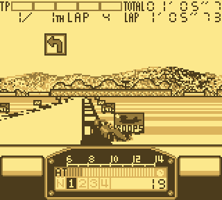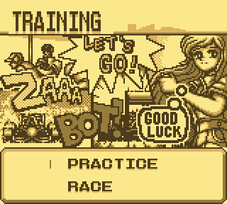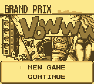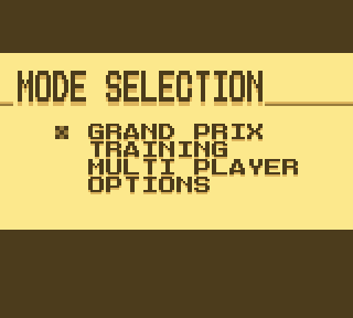 Le désormais célèbre écran titre Nintendo descend lentement, et se place au milieu de l'écran. Puis vient le titre du jeu, accompagné d'une musique typique « Jeu Garçon » (oui, je sais, c'est nul). Appuyez sur start, et 4 choix vous sont proposés : Grand Prix, Training, Multi Joueurs, et le désormais classique options.