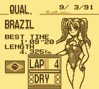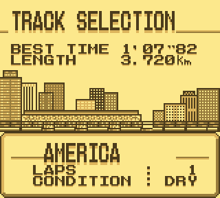 Après avoir fait ces choix judicieux, entrons dans le vif du sujet. Calme toi petit branleur !!! Tu seras champion du monde plus tard. Pour l'instant, tu vas juste t'entraîner un peu. Tiens, ça tombe bien, y a justement un mode training. 2 choix sont proposés : « practice » ou « race ». Pour le practice, on a le choix entre 17 tracés. En haut de l'écran, le meilleur tour. Si vous voulez être en pole dans le mode Grand Prix, il faut battre ce temps. Malheureusement, la mémoire est insuffisante, et ne sauvegarde pas vos meilleurs temps. En dessous, la longueur du circuit. Puis, le pays. Enfin les 2 trucs que vous pouvez choisir : le nombre de tours (de 1 à 10), et la météo. Un temps tellement pourri que vous n'y enverriez même pas votre chien vérolé ? Ou alors un temps suffisamment sec pour faire cracher le feu à votre pot d'échappement ? Qu'à cela ne tienne. Une simple pression sur la croix directionnelle, et le tour est joué.