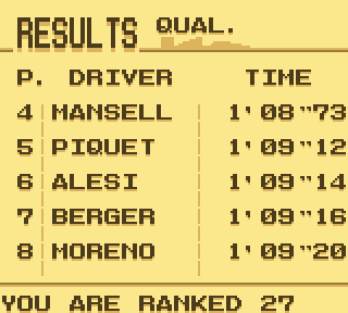 Appuyez sur un bouton, et rigolez. Et oui, les résultats s'affichent. Quand on voit que le 2ème est à, à peine, 20 centièmes derrière vous, que, sur les 16 pilotes qui ont pris le départ, aucun n'a abandonné, et que les 16 pilotes en question se tiennent en 3 secondes environ. alors que vous avez mis 4 tours à chaque branleur présent sur la piste, il faut le dire, ça fait sourire.