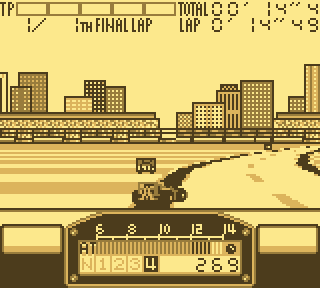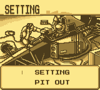 Au départ, on accélère tellement mal qu'on se retrouve entre la 4ème et la 6ème place avant de faire gueuler la cracheuse de feu. Une fois lancé, vos concurrents sont tous morts. Evitez de leur rentrer dedans. Ca fait perdre un temps que, justement, on n'a pas à perdre (en gros, ça énerve). Décrivons votre écran : en haut à gauche, les 5 petits rectangles, c'est tout simplement ce qui est niqué sur votre voiture : pneus, ailerons, freins, suspensions, châssis. Les pneus sont ce que vous verrez apparaître le plus souvent. Au passage, pour l'anecdote, j'ai essayé de faire de ma caisse une ruine. Le seul élément à avoir résisté est le châssis. Si tu as réussis à l'éclater, tu as mes salutations, et mon plus profond respect. Mais il me faudrait une preuve. Prends une photo ou une capture de la scène, envoie-la à EcstazY, et tu seras sur le site. Ce sera pour toi, je suis sur, l'accomplissement de toute une carrière. Bref, en dessous des rectangles, à gauche, votre position. Le 1/16th sera ce que vous verrez le plus souvent. À côté, le nombre de tours qu'il vous reste à faire. À droite, les chronos. En haut, le temps total, en dessous, le temps au tour. A la fin de chaque tour, le « PIT » avec une flèche, c'est les stands. Braquez dans la direction de la flèche (oui, au risque de sortir de la piste. Vous en faites pas, vous risquez rien). Sélectionnez « REPAIR » pour voir ce qu'il y a à réparer, « SETTING » si vous voulez changer des réglages (passer en pneu pluie par exemple), et « PIT OUT » si vous voulez quitter les stands. Vos gentils mécanos vous font alors les réparations demandées.