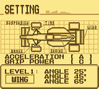 Une fois que c'est choisi tout ça, passage obligatoire par les stands pour les derniers réglages. Vous pouvez choisir votre moteur, l'angle des ailerons, le type de châssis, les pneus (slick ou taillés pour la pluie)… On fait ça uniquement pour se marrer, car, vous l'aurez compris, ça ne sert à rien. Quels que soit les réglages, on n'ira pas plus vite, ou on n'adhérera pas plus à la route. D'où une suprême poilade, et en même temps, un délire perso à tailler sa caisse pour la vitesse (genre ailerons rabaissés à 25°, moteur Porsche (en F1… ouais. Pourquoi pas ?), genre on va courir à Monza), avec des pneus slicks, quand on court à Monaco sur un circuit détrempé. Véridique, j'ai fais la pôle, et je leur ai mis mon pied, là ou ça fait mal, au point qu'elles étaient devenues petites et bleues, et qu'ils sont tous partis pisser du sang, et glairer les couilles dans les chiottes du paddock (merde à la censure).