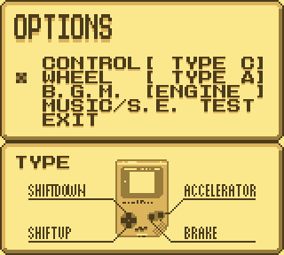 Rien qu'au niveau des options, ce jeu représente un certain intérêt. En effet, pas de « easy, medium, hard ». Rien que ça, c'est pas mal. Ne vous en faites pas, le jeu est quand même très simple. Vous pouvez aussi choisir le placement des boutons, à comprendre comment vous voulez diriger votre petit bolide. 8 possibilités vous sont proposées. Dans chaque section options, il en faut au moins une dont tout le monde se fout. Présentement, c'est la suivante : ami internaute, es-tu un puriste ou un night clubber ? A comprendre, quand tu pilotes, tu veux entendre le doux bruit d'un moteur crachant des poneys (oui, celle- ci aussi est nulle. Chui chaud aujourd'hui), ou une musique aujourd'hui samplée par les plus grands de la nuit parisienne (David Guetta, Régine, Yvette Horner...) ? Il y a également l'option « wheel », où vous pouvez choisir entre le type A et le type B, mais perso, j'ai pas compris ce que c'était. Le must de ce qui se fait de mieux, c'est le test de musique. Toutes les pauvres successions de notes du jeu y sont (y'en a quand même 70, toutes les écouter, ça prend du temps). De la musique d'intro du jeu, au bruit du moteur quand on passe la 2nde, tout y est. C'est énorme.