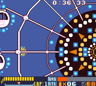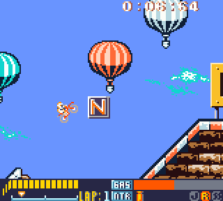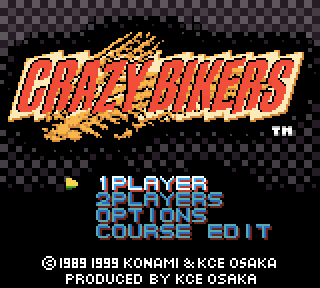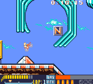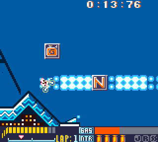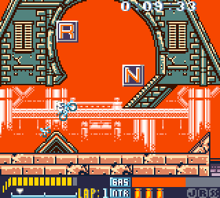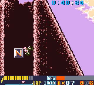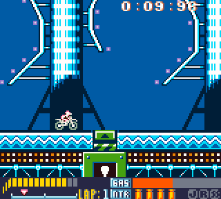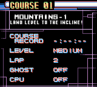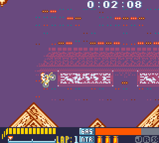 On allume la bête et on se retrouve face à un écran, de bien belle facture. Si si disons le franchement moi j'aime beaucoup. Un pur style Game Boy Couleur. Mais toujours l'appréhension à la gorge (oui c'est une expression, ça ne veut rien dire en soi) je regarde les options. On peut choisir la couleur de son gars (bien, c'est con mais c'est sympa), le niveau de difficulté des chronos, et le handicap. C'est quoi ça ? Non, notre héros ne va pas sortir son fauteuil roulant pour remplacer sa moto, ne vous inquiétez pas... C'est l'option qui permet si on est dernier d'aller un peu plus vite que les autres. Oui, je sais vous êtes un mec taillé pour la sueur et le sang et vous ne serez jamais dernier. Mais c'est pour les djeunz qui débutent. L'ordinateur se remet donc miraculeusement à remonter sur vous comme une balle, jusqu'à ce qu'il vous double et à ce moment là, ce soit vous qui fonciez. Ah ah, plus d'ordinateurs surhumains qui foncent tout seul, au boosts illimités comme dans le premier ! Enfin un ennemi "réel". Ouf. On peut donc enfin se lancer dans la course proprement.