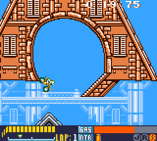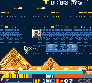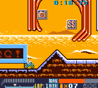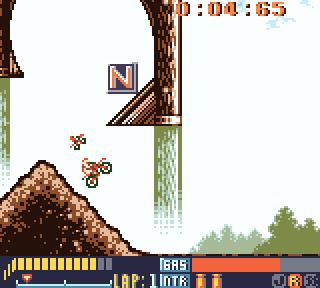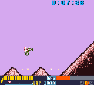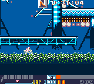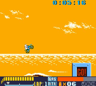 On choisit le mode championship pour se faire la main. Ah le tout en couleur avec enfin une vraie interface. Bien, voilà une bonne nouvelle. J'aime bien le oldisme, mais je ne crache pas sur un tout petit peu de couleurs, faut pas déconner non plus. Tout est mignon. On note qu'il y a 10 circuits, avec 5 thèmes graphiques différents : le cross, le front de mer, la fête foraine, le stade et la vieille ville. On choisit le premier niveau pour débuter propre et au taquet. Magnifique. Les couleurs sont belles, les décors fins. La moto est toujours bien root, faite de 13 misérable pixels (non, je n'ai pas compté, c'est juste pour dire qu'il n'y en a pas beaucoup). On peut donc penser que l'on va retrouver les sensations d'antan. Et pour vous éviter de lire jusqu'au bout, ... Non je ne le dirais pas, lisez jusqu'au bout merde alors! On a donc un jeu qui est la suite d'un des mythes de la console, en couleur qui reprend au premier abord les graphismes du premier en mieux. On ne peut qu'aller de l'avant !