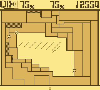 Là c'est un jeu de réflexion complètement crétin dans le principe. En bon oldies, vous savez que généralement qui dit « simple » dit « exceptionnel ». Oui, les jeux de réflexion oldies qui ont brûlé sur l'autel de la légende sont les plus simples. Bordel on n'avance pas dans la critique là je passe la seconde. Le concept est donc simple. On dirige un je ne sais trop quoi (un petit carré) sur un carré. Le but va être de faire des aires colorées sur le plateau de jeu. Le but par niveau est de couvrir un pourcentage du plateau. On se déplace en traçant des lignes, qui en rejoignant le bord ferme une aire et la valide. Oui, cela n'a l'air de rien comme ça, tracer des lignes pour faire des aires… Passionnant… C'est oublier qu'il y a bien entendu des trucs pour compliquer un peu les choses, normal.