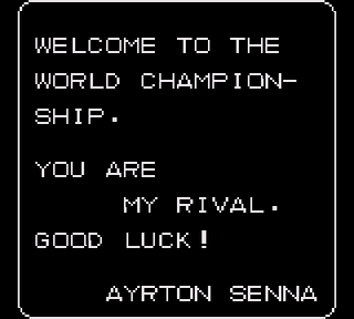 Heu... Attendez. OK en 2009, alors que ca fait des années que Senna a avalé ses dents sur le mur d'Imola, on comprends qu'on ait du mal à saisir ses paroles, mais le jeu est sorti de son vivant. Bon, après analyse dans les meilleurs labos ricains, il s'avère que ce que l'on peut entendre à travers les minuscules et vieux haut-parleurs de la console, c'est le brésilien en train de vous féliciter dans la langue de Shakespeare et de sa fille Britney. Bien tenté quand même, mais on comprend que beaucoup d'autres éditeurs aient préféré s'abstenir.