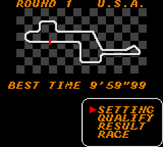 Je dis non parce qu'on est en présence du prototype même de ce qui a constitué, pendant tout le début de l'ere vidéoludique, l'essence des jeux de courses. Prenez une route grise, mettez sur le bas côté des bandeaux rouges et blancs (ou pas dans certains cas) et collez à 3 centimètre du bitume des panneaux publicitaires, poteaux ou autres arbres (dans ASSMGP II, on se contentera des panneaux de virage et des piles de pneu). Sur ce décor rudimentaire, collez un sprite de voiture quelconque que vous affublerez d'un sous-virage hallucinant (pour les non-initiés, quand vous tournez le volant, ca tourne pas ou peu) dont le but est de slalomer entre les voitures qui roulent 4 fois moins vite que vous (bah oui forcement, on a pas les moyens de leur coller une IA leur permettant de vous tirer la bourre). Le tour est joué et finalement on a pas beaucoup avancé depuis le jeu de Formule 1 livré sur les consoles Pong.