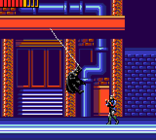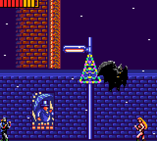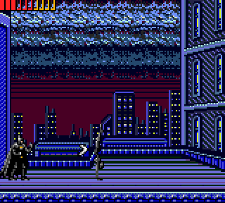 On allume sa bouffeuse de piles préférées, et on admire. L'écran titre est bien sobre, et la musique typiquement Game-gearesque. Bien. Un bref écran nous annonce la couleur. Un beau jour l'ami chauve souris se ballade dans la rue en costume (jusque là rien d'anormal) et aperçoit une jeune femme au bord du suicide sur le toit d'un immeuble. Batman ne se sent plus péter et entame la grimpette sur l'immeuble en question. Il monte il monte il monte et là pas de bol, la meuf saute. Dur. Il la voit passer sous ses yeux avec les yeux d'un cocker lorsque l'on met son bol à la poubelle (très belle image que je garde pour plus tard). Il descend voir comment elle va (normal après une chute de 18 étages) il numérote les abattis, et pas de bol, le pingouin prend une photo, et va dire à tout le monde que c'est Batman le coupable. Arf