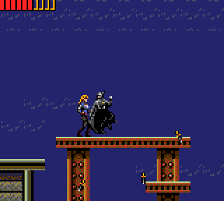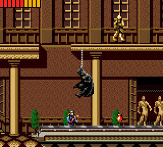 Et Batman dans tout ça, que devient-il ce pauvre petit animal ? Et bien il est bon, très bon même. La maniabilité est bonne. Pas parfaite, car il possède pas mal d'inertie en vol ce qui peut être handicapant pour être précis sur un petit saut. Mais il répond assez rapidement quand même, il n'a pas le phénomène paraplégique. Ouf. Il possède d'ailleurs une option que j'adore, son grappin. Il saute, voit le plafond, et tire pour s'accrocher. Bien sûr la longueur de la corde est limitée, et il faut donc réfléchir en un millième de seconde pour tirer au bon moment. L'autre "truc qui tue" sont les grands sauts de Batman. Lorsqu'il tombe du haut d'un immeuble pendant un certain temps, il déploie ses ailes et se met à planer, dans une posture vraiment superbe. Je me vois encore sauter du haut de la plus haute poutre du niveau 3 juste pour le voir planer comme un gland... Ça c'est la puissance du Ricard et du Tang...