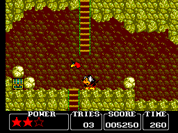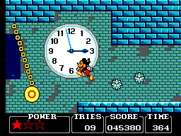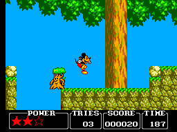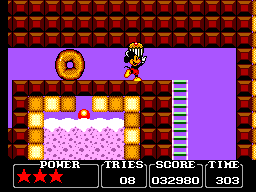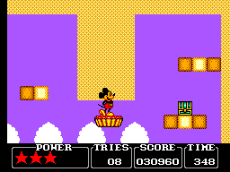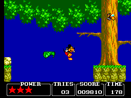 Pour ce qui est des boss, c'est la même: ils ne sont pas très durs à battre (3 coups sur la gueule en général) mais nécessitent une technique bien particulière qu'il vous faudra trouver assez rapidement (le chrono tourne) sous peine de perdre bêtement des continus. Tout au long de votre périple, vous ramasserez des pièces de monnaie plus ou moins grosses (des points), des parts ou des gâteaux entiers (de l'énergie), des oreilles de Mickey (une vie supplémentaire) et parfois des étoiles, qui ajouteront un point de santé à votre barre d'énergie (vous commencez avec 3 et pouvez aller jusqu'à 5). Bref, rien de bien original.