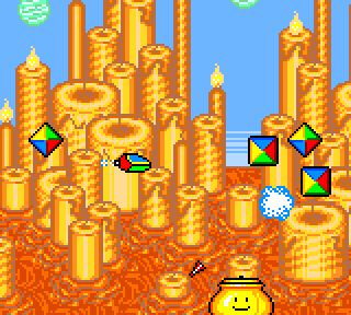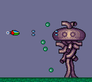 Scrolling multidirectionnel, c'est hyper déstabilisant. Le petit vaisseau avance dans un décor aussi très haut en couleurs, beau, voire magnifique pour notre petite console portable. Le vaisseau fait donc se déplacer le décor de haut en bas et gauche à droite. Le temps que le décor suive, on peut se retrouver face à face avec un hamburger géant, et mourir comme une daube. Je dirais que la gestion du scrolling est véritablement le point de manœuvre du jeu, le geste à avoir. Vu qu'il n'y a pas de continue, se serait salaud de perdre une vie comme une merde en se retrouvant face à un petit triangle vert de merde… A propos, on se bat contre qui ?
