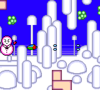 Ah ah les ennemis ! Encore une touche haute en couleur ! On se bat selon les niveaux contre des ennemis de différentes tailles. En tuant tous les gros monstres d'un niveau on passe au niveau d'après. Les petits ennemis apparaissent de manière aléatoire. C'est grand, il peut y avoir 15 ennemis à l'écran, aucun ralentissement, rien, tout est super fluide, c'est génial, j'adore ! La difficulté est bien présente, car comme vous vous en doutez, la fluidité relative du scrolling du décor, associé à la multitude d'ennemis possible sur un seul écran, tout cela donne un jeu relativement balèze. De plus les boss sont plutôt du genre ardu. Quand on les connaît, eux et leur pattern d'attaque ils sont d'une simplicité enfantine, mais au début, on perd des vies comme une merde, c'est assez frustrant. Un jeu relativement dur, mais si passionnant !
