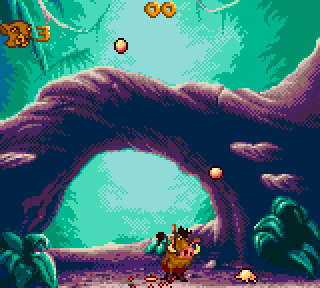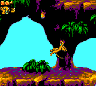 Le roi lion n'est pas sorti que sur Game Gear, ce serait ridicule. Sur toutes les consoles de l'époque, donc la Megadrive. Dans le dessin animé, un des moments forts techniquement reste la course avec les gnous, quand le roi meurt (nom de dieu j'en verse encore une larme. De rire. Excusez-moi d'avance auprès de ceux qui ont pleurés à cette scène). L'informatique avait multiplié les gnous, ce qui était une première. Et dans le jeu sur 16 bits, ils avaient bien retranscris la scène. Là sur Game Gear c'est un peu la blague, avec une pauvre partie plate forme, avec 3 gnous qui nous poursuivent. Très amusant. Cela donne un peu de variété à l'ensemble. C'est un des intérêts du jeu c'est son côté "allez hop, on va leur en mettre pour leur argent ah ah !". Frais.