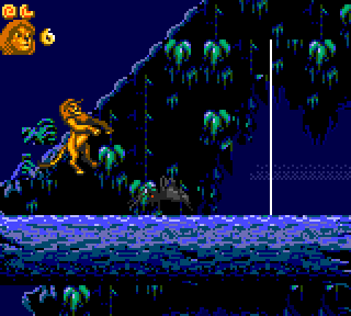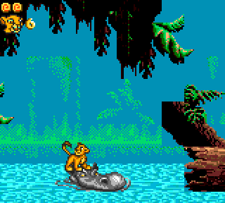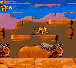 Hop, on joue avec le lionceau. Début du jeu = début du film. Oui, le jeu se joue sous forme de tableau, qui bien sûr respecte le film à la lettre. On commence donc avec l'enfance de notre apprenti roi lion. Il se balade dans les rochers. Premier constat. Le lionceau se manie étrangement, avec une sorte d'inertie assez forte. Genre : hop il sautille pour chopper un méchant porc-épic (oui, le premier niveau est l'équivalent d'un goûter pour nous humain, à savoir un parangon d'enfance), il saute en avant, mais très difficile de l'arrêter pour modifier la trajectoire. Oui, on peut le dire, cela demande un petit coup de main. Rien de rédhibitoire, vraiment. Le premier niveau est là pour vous faire les griffes. Ennemis à chier et plates formes de tests sont là. Nickel. Un boss à la con, et on enchaîne. Nickel.