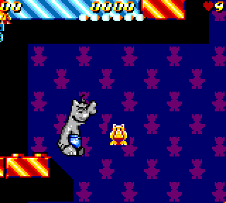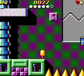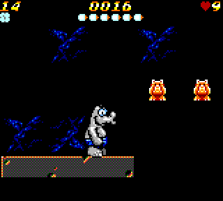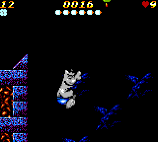 Par contre, on n'échappe pas à quelques effacement de sprites, surtout au niveau des ennemis, à cause de la barre d'item (en haut de l'écran), ce qui est assez gênant et traître lorsque l'on saute sur un plateforme et que celle-ci est déjà occupée par une bestiole. Aussi, autant jouer la sécurité en déplaçant le cadrage vers le haut (petit plus très pratique qu'on ne retrouve hélas! pas dans tous les jeux de plate-formes).