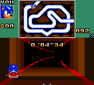 Au lancement, un bel écran titre coloré. Trois championnats, ou des speed run. Bon esprit, ça permet de se chauffer. Et puis le choix du héros, avec ses caractéristiques propres et son petit goodies personnel. Un panel assez improbable : Sonic bien évidemment, qui a son petit boost lorsqu'il collecte trois pièces, Sonic Metal qui lui n'a besoin que de deux pièces pour son boost, Tails peut faire un saut pour éviter les obstacles, Knuckles punche ses ennemis, Fang lâche des flaques d'huile et Eggman pose des mines. Eggman ? Probablement un problème de licence. Il s'agit vous vous en doutez du bon vieux Dr Robotnik…