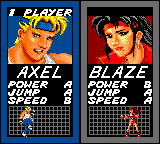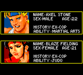 On se retrouve donc avec un Streets of Rage sur sa transportable. Bien sûr comme tout bon beat them all qui se vaut, il y a un scénario béton. Bien évidemment, il ne s'agit pas de sauver le monde, comme vous y allez ! Il s'agit tout simplement d'endiguer le crime dans une ville où règne la terreur, et ou la pègre a pris le contrôle, à l'aide de politiciens véreux et lâche. C'est écrit dans l'intro, je n'invente rien. Donc vous allez sauver la ville. Ok, trois fois rien, ah ah. Bien sûr il aurait été trop simple d'être la brebis forte, la pierre d'angle de la ville, en étant un bon policier genre RoboCop. Vous allez donc incarner un déchet de la société, la lie de tout, un ex-policier. Et oui vous n'avez pas la vie facile, c'est dommage hein ? Comme dans tous les SoR, on va pouvoir choisir son personnage, qui ne sont bien évidemment pas du tout cliché. On a Axel, le grand blond ultra musclé, taillé dans le roc, capable de survivre 6 mois dans la jungle en mangeant ses propres excréments, et Blaze, la tigresse brune, en noir et rouge. Elle aurait pu être en uniforme, en tailleur, en jogging, et bien non, tenue ultra moulante noire et rouge. Normal. Bien évidemment ils sont accompagnés des caractéristiques qui vont bien. Axel est costaud mais n'avance pas, et Blaze est frêle comme un roseau, mais trace. Et c'est parti pour l'extermination.
