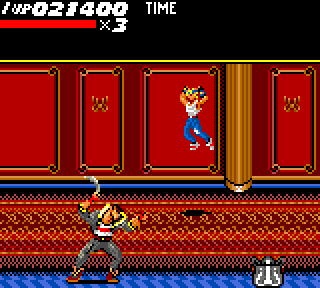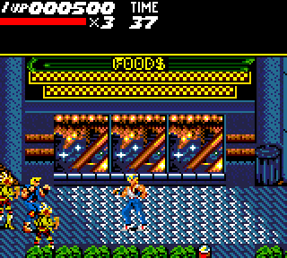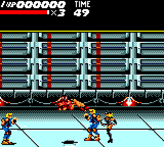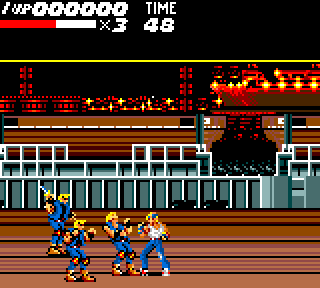 Oui, mais c'est un détail. La musique. La musique va avec les immeubles carrés : oldies à souhait. On en mangerait. Des beats complètement roots, des mélodies exceptionnelles, c'est un véritable bonheur pour les oreilles ! On prend un malin plaisir à écouter les musiques du jeu. Malheureusement il n'y a presque que ça. En effet la difficulté générale est énorme. C'est-à-dire que vous allez en chier, même en mode easy. On défonce les boutons de la Game Gear, en mettant le paquet pour tenter de s'en sortir. Et le pire dans tout cela, c'est que c'est chronométré… Une horreur. Une fois complètement dedans le jeu est très court. Ce n'est pas les salves de trois gars qui arrivent par trois gars qui arrivent qui font frémir, c'est le chrono. Rien que d'y repenser j'en tremble…