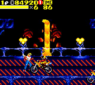 Ici les graphismes sont bons, enfin. Les ambiances sont presque l'identique des épisodes Megadrive, et c'est du bonheur. La ville a toujours ce petit côté oldies 90 exceptionnel, avec ses immeubles carrés, ses néons fluos, ses pavés trempés de la fraîche rosée du matin… On aime. On ne peut qu'aimer d'ailleurs. Vous n'aimez pas ? Ah ah mais tu consommes de la drogue ou quoi ? L'ambiance graphique est donc exceptionnelle pour un jeu Game Gear. On prend un malin plaisir à avancer juste pour voir quelle sera le prochain décor. Saviez-vous aussi que la plus belle couleur de la Game Gear est le bleu outremer ? Et bien maintenant vous le savez, et vous pouvez le découvrir dans le niveau de la caverne en fusion. Les reflets des rochers en fusion sont à base de cette couleur, et le bleu outremer (quasiment un bleu Klein (qui a dit que l'on n'apprenait rien sur ce site bordel ?)) allié à la vigueur du orange et du jaune, c'est magnifique. Un très bon point pour les graphismes.
