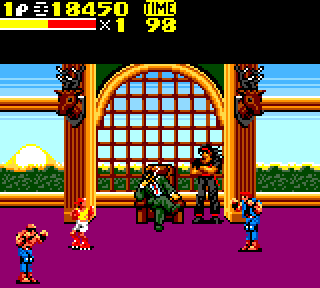 Et nos deux compères sont accompagnés d'un petit nouveau, Skate. L'adolescent cool, la casquette rouge en arrière, de type africain (le type, pas la casquette). Et comme son nom l'indique, il fait du… Skate. Non, je plaisante, ah ah cela se saurait. Oui, je plaisante beaucoup aujourd'hui, mais toi là qui me lis, tu as les yeux qui sentent le vice alors j'essaye de détourner tes mauvaises pensées… Skate est donc le djeunz cool des années 90. L'histoire ne parle pas de lui, qui est-il, d'où vient-il ? On peut supposer qu'Axel était un pote de son frère, frère qui a péris dans un accident de mixer, et qu'Axel s'est juré de veiller sur lui toute sa vie… Ou quelque chose de ce genre. Bien sûr Axel en bon décérébré veille sur lui en l'envoyant casser du méchants dans les rues. Skate n'a aucune capacité. Si j'étais bilingue je dirais qu'il est useless. Il va vite, mais tape avec ses petits poings de pré pubères sur des types qui font 4 fois sa taille. L'échec. Bon bref, on se retrouve avec notre brochette de héros, qui part sauver une nouvelle fois la ville.