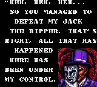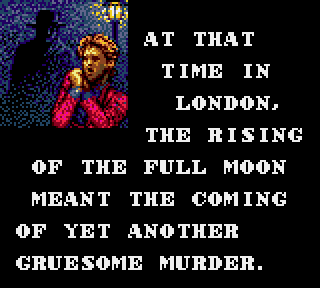 On y incarne le Docteur Social dans son enquête pour élucider des meurtres sordides dans ce Londres de l'angoisse. Le brave homme conduit par notre modeste personne va avancer de niveau en niveau pour s'apercevoir que pas de chance, Jack l'éventreur n'est qu'un fantoche, et que le vrai monstre derrière ces crimes crapuleux n'est autre que Dracula en personne. Action, sang, morts-vivants et autres trucs creepy en diable vous accompagneront pendant une petite heure pour vous donner ce que la Game Gear a de meilleure.