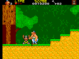 Notez la technique des guerriers gaulois, combattants l'ennemi à mains nues et parfaitement rompus à la course et au saut. Au passage, les historiens soutiennent mordicus qu'Astérix était plus enclin à la ruse et à l'agilité par son double saut, tandis qu'il laissait le gros des combats (bien qu'il était juste enveloppé) à son compagnon d'aventure.