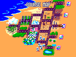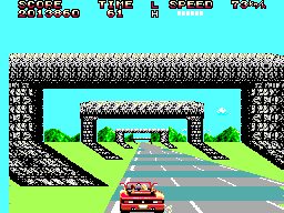 Ajoutez à cela les limites connues des consoles 8bit en terme d'affichage de sprites et vous expliquez aisément pourquoi votre caisse devient une véritable savonnette quand elle passe sous des colonnades et autres check points. L'astuce consistant ici à carrément changer le gameplay en « vérouillant » la caméra sur une longue ligne droite pour renoncer au raster effect et permettre l'affichage de gros éléments de décors en arrière-plan. Pour les plus curieux je vous invite à consulter