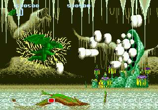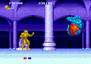 Jeu de lancement de console oblige, le potentiel de la machine n'est pas pleinement exploité. La Megadrive assure même le minimum syndical. Pour la petite info, le jeu nous vient directement de l'arcade, le System16 de SEGA. La conversion vers nos salons douillets est plutôt réussie. Reste que le jeu est tout de même ancré dans les années 80. Rassurez-vous, il ne porte pas de veste en jean et n'est pas coiffé avec une nuque longue. Non, mais la réalisation n'augure pas encore toutes les merveilles dont va nous régaler la petite machine japonaise. Soyons bref, clair et précis : Altered Beast accuse le poids des ans. Peu de couleurs, des sprites au minimum syndical, une animation qui ne doit pas donner des sueurs froides au processeur principal et une musique qui vous fait pousser cette réflexion, laconique : "tiens, y'a de la musique en fait". En résumé, le jeu n'est pas très beau, plutôt raide et assez vide. Peste, que reste-t-il donc à sauver dans cette production ?