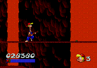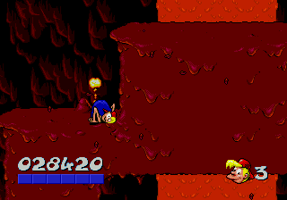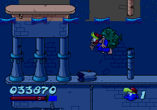Nous y voilà donc : de la plates-formes à énigmes. Un concept excitant en diable. Le cocktail subtil entre la frénésie de la plates-formes et la monotonie routinière d'un jeu d'aventure. Vendu. Pourtant, le jeu commence classiquement. Les premiers tableaux se présentent de façon tout a fait innocente : on marche, on saute et on dégomme de temps à autre les inconvenants se dressant devant vous de vigoureux coups de bâton. On envisagerait presque d'esquisser un bâillement si ne venaient pas rapidement les quelques épices donnant tout le fumet de ce plat de gourmet. Car assez rapidement vous devrez redistribuer une partie de l'énergie consacrée à vos pouces et votre système digestif vers l'amalgame spongieux qui vous tient lieu de matière grise. Oui, toi y'en a devoir réfléchir. Je sais, cela risque de piquer un peu pour certains, plus habitués sur cette console à manier des barbares cimériens, des ninjas furibonds et ou des chasseurs assermentés. Quoiqu'il en soit, il va falloir faire face aux obstacles qui vous narguent dans votre escapade. Et c'est là que se brise la routinière heu... routine des jeux de plates-formes. J'applaudirais des deux index si ce n'était pas aussi ridicule. Une progression donc rythmée par la résolution d'énigmes où le concept de loufoquerie donne le la. Il n'est pas rare d'être sottement bloqué dans une pièce sans issue apparente, tel un imam à l'Oktoberfest. On tutoie même l'exaspération à certains moments. Ahaha, on fait moins le malin à mouliner dans le vide pour chercher comment avancer. Ils sont où vos dragon punchs et vos mega blasters, hein ? Une exaspération en générale relativisée dans l'instant de sa résolution par un "ah les cons" accompagné d'un sourire niais. Oui, vous avez le sourire niais, le niez pas. J'ai les photos de votre communion.