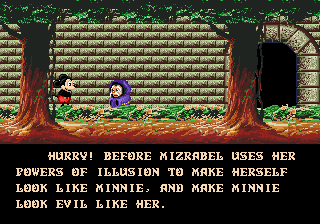 La réalité m'explosa à la figure le jour où je pu me procurer une version anglophone du jeu. En vérité, les deux tourtereaux fêtaient tout simplement leur amour dans les herbes folles quand la sorcière Mizrabel apparut et décida d'enlever Minnie. Sa seule motivation : une jalousie maladive pour la petite souris, égérie du monde entier de par sa beauté et sa popularité. En utilisant ses pouvoirs d'illusions, l'édentée espérait inverser leurs enveloppes corporelles et, ainsi, devenir elle aussi la nouvelle Lindsay Lohan.