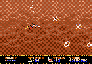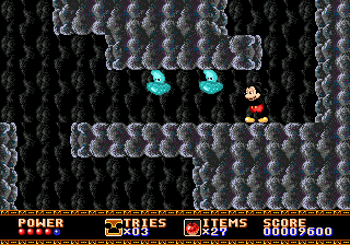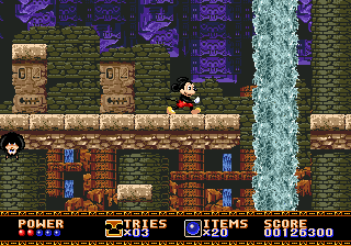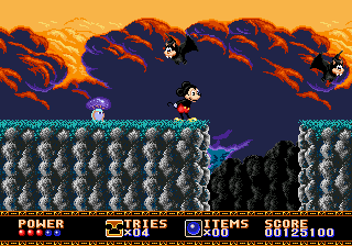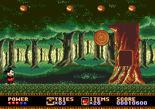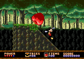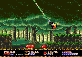 Le mien provient de la secte du double saut, mais vous pouvez également opter pour le saut+attaque, ou le saut+bas. Quoiqu'il en soit, on peut toujours profiter d'un rebond pour se faire deux ou trois adversaires à la suite. Dans ce premier tableau, on peut également s'essayer à la suspension aux lianes sans avoir à se soucier du vide ou ramasser des pommes rouges sans aucun doute empoisonnées. Mickey, ne se risquant pas à tenter l'expérience de l'ingestion d'un des fruits de la vieille femme, s'en servira comme projectile avec succès.