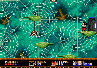 Lors de la seconde partie de niveau, ça se corse un tantinet, avec des précipices à traverser et des feuilles volantes et coupantes. Attention. Bien pire que celle de votre dernier bouquin qui vous a arraché un cri aigu lorsque vous avez tourné une page sans prendre garde à la tranche. Mais toujours pas de quoi non plus s'offusquer d'une difficulté délirante... Jusqu'à la surprise de l'arrivée d'une pomme géante qui tentera de vous écraser dans une descente, et la découverte plus loin d'une zone où les araignées, bien que vraiment très mignonnes, sont de taille conséquente. Ou alors avez-vous subi une réduction de taille. Peu importe finalement, puisque Mickey est de toute façon une souris géante. C'est un simple et juste retour des choses.