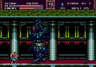 Mais ça sera pour son plus grand bien. Castlevania Bloodlines n'est peut-être pas le meilleur Castlevania de l'époque, il est un poil iconoclaste sur les bords, il n'a pas la cohérence absolue de son grand rival, mais il n'en reste pas moins un excellent jeu, irréprochable, dépaysant, vif, et technique. A l'époque au moins, on ne faisait pas que de portages bidons d'une plate-forme à l'autre, non, on se sortait les tripes du coude pour faire saigner l'adversaire, et ce jeu est l'une des plus belles illustration de ce bon esprit qui nous a donné tant de plaisir.