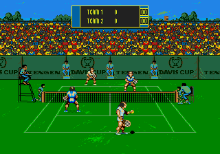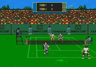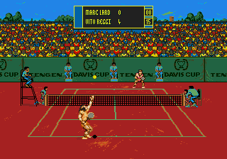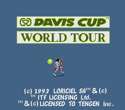 Après avoir ramassé mes bras (oui parce que bon, c'est quand même plus pratique), j'entrepris de farfouiller dans ces tas poussiéreux d'éléments électroniques divers et variés. Parmi tous ces jeux, le lot Megadrive avait un côté assez irréel. Imaginez une dizaine de jeux dont la valeur ludique totale excède à peine celle de Jordan vs. Bird (excède, puisque en l'occurrence ledit jeu était dans le tas). Tant de daubes d'un coup étaient trop pour moi, mais au milieu brillait un Graal, Davis Cup World Tour Tennis. C'en était trop, le souffle tiède de l'aventure caressait mollement mon visage, et les vapeurs d'alcool à 90° (parce qu'il fallait bien dégager les contacteurs de leur gangue de crasse) aidant, j'enfournai la cartouche dans la Megadrive. C'est ta mère que j'enfourne, je sais.