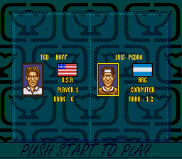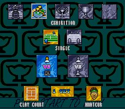 Voici l'écran titre, d'une sobriété toute 1993. Il n'y a même pas une indication pour appuyer sur start. En revanche, on voit un mec courir au fond, avec une animation carrément désastreuse, renvoyer des balles sur l'écran, qui semble être du coup un mur d'entraînement. Soit. Enfin, cette analyse est faite à postériori, hein, parce que bon, la première fois, il faut bien quelques minutes pour réprimer le fou-rire qui s'empare du joueur à la vue de cette course absolument calamiteuse, genoux bien haut, genre « hop hop hop ». Associez le tout à une musique totalement hors de propos (caractéristique des jeux d'aventure Amstrad des années 80, en gros) pour obtenir une espèce de sensation d'irréalité tenace.