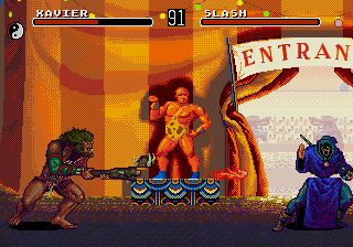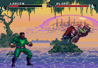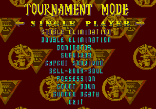 Car les plus, les voici! Tout d'abord, les persos cachés, disponibles par cheats (en cherchant un peu...), sont au nombre de... 11! Oui, vous avez bien lu. En fait, il y a 6 persos "normaux" (dont le Champion Eternel et le Dark Champion) et 5 animaux, allant du chihuahua au serpent en passant par le hibou. OK, ce ne sont pas vraiment des persos à part entière, et jouer avec eux est assez déloyal compte tenu du fait qu'ils se trouvent hors de portée des coups de base des autre persos (va mettre un front kick à une poule, toi). Néanmoins, leur présence rappelle que l'on peut se faire des bons délires avec un pote. Ensuite, il y a les "fatalités" (c'est marrant comment ce terme est devenu générique depuis "Mortal Kombat"): ÉNORME!!! 2 fatalités par décors (une "surenchère de tuerie" et une "mort subite"), 1 vendetta (par le joueur mais dur à exécuter) et une "cinétuerie" (le must: la mort du personnage en 3D, exécutée par le Dark Champion en personne). En plus, il faut reconnaître une chose: elles sont vraiment très gores! On irait presque à se demander si les programmeurs sont vraiment des gens normaux lorsqu'on réfléchi l'espace d'une seconde à "comment en sont-il venu à penser faire un truc pareil?" tellement certaine sont écœurantes: tripes, boyaux, sang, vomi, tout y passe! Et, l'air de rien, ça apporte beaucoup au jeu. Enfin, parlons des options de jeu, et plus principalement des divers modes de tournoi: 15 modes de tournoi différents, auxquels on peut jouer seul ou à plusieurs. Un mythe! Seul petit regret par rapport à la version cartouche: la disparition du mode "salle de combat", qui apportait une petite touche excitante aux parties à 2 joueurs.