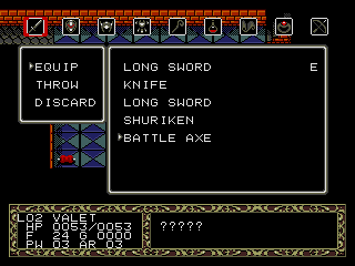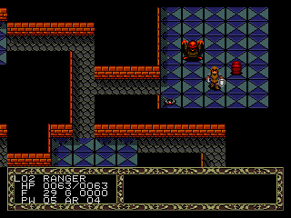Le jeu démarre donc dans le village de St-Samson-la-Poterie, Trykaar armé de son T-shirt questionne les villageois sur sa quête avant de filer se tailler un museau de dragon pour le déjeuner. Le jeu démarre, je ne sais vraiment pas à quoi m'attendre même si cette introduction va presque me faire regretter de ne pas avoir payé sa croûte au clochard, Trykaar apparaît dans un donjon généré aléatoirement, au premier étage d'une longue série der 30 pour enfin faire comprendre à ce Dragonia qu'il n'est plus le bienvenu en ces lieux parce que merde on n'est plus nulle part chez soi. Pour mener votre mission qui fait franchement pitié, il vous faudra simplement récupérer les équipements disponibles à chaque étage pour défoncer les monstres et il y'a de tout, épées haches, lances, shuriken, casques en cuir, armures, bâtons magiques, parchemins, potions bouclier et compagnie, classique. A vous d'équiper les éléments vous conférant les meilleures statistiques on connaît la chanson.