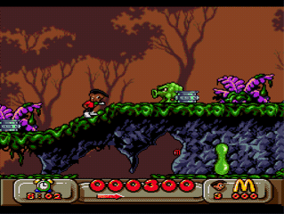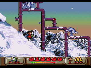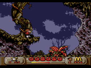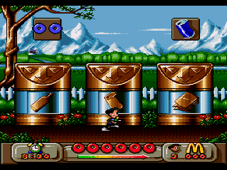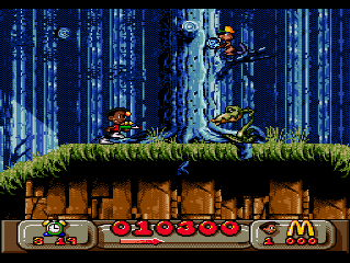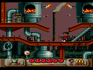 On aurait pu se demander ce que Virgin (roi du Coca qui fait pisser) et McDo auraient pu produire ensembles sur un plan vidéo-ludique : un labyrinthe à frites avec un bac à huile comme sortie ? Un beat them all ou vous dégommez des bœufs à coup de hachoir, pour les transformer en Big Mac ? Et bien non ! Deux petites frimousses, rois du ketchup, naquirent, Mick et Mack, qui virent leurs premières aventures défiler dans un jeu de plates formes sur Nes à la belle époque, à la recherche des Pick Nick volés de Ronald. (Bah oui… il faut bien qu'il y ait de la bouffe au bout du système !)