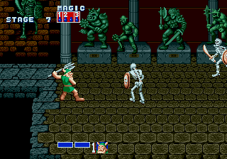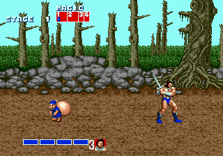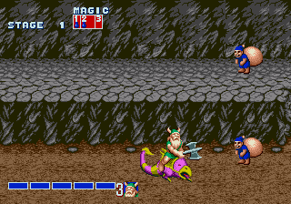 On peut également user de plusieurs sorts, différents selon les personnages : magie de la terre pour le barbare, du tonnerre pour le nain, du feu pour l'amazone. Leur utilisation est pour le moins originale : on commence par remplir une jauge grâce à des potions récupérées en bottant le cul de petits lutins qui passent de temps en temps à l'écran (toi aussi, pond tes idées de gameplay sous acides). Ensuite, plusieurs choix s'offrent à nous : soit on utilise souvent la magie et on est condamnés à lancer des petits sorts péteux, soit on attend que la jauge soit remplie pour se lâcher le slip. Et attention, les persos n'ont pas la même puissance: le nain n'a que trois crans dans sa jauge, quand l'amazone en a six.