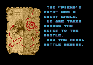 Et je ne vous ai pas parlé de la bande-son. Souvenez-vous : « Pour des raisons de budget, la scène suivante sera entièrement bruitée à la bouche ». Ici c'est pareil : plif paf pan bloum raaaaaaaah tout au long du jeu. Flippant. Heureusement, la musique sauve quelque peu la mise avec des thèmes épiques qui collent bien à l'ambiance « Conan le Barbare, version non expurgée ».