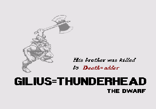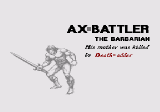 Golden Axe est un Beat'em all comme on en fait plus. Laissez-moi vous conter l'histoire : Death=Adder est un super méchant. Le genre qui ne se brosse pas les dents, qui s'entraîne tous les soirs dans sa chambre pour maîtriser le mouvement de sa cape noire, qui a pris rire diabolique LV1 au bac, et qui répond à ses parents. En mal de reconnaissance médiatique, il capture le roi d'un pays quelconque, ainsi que sa fille super canon (ça c'est pour donner envie de finir le jeu). Il a également mis la main sur une hache hyper-puissante (d'où le nom du jeu, ha ha !) et menace de tout faire péter si on ne lui fournit pas ses mille vierges quotidiennes. C'est dans l'ordre des choses.