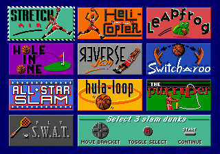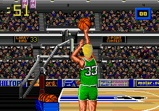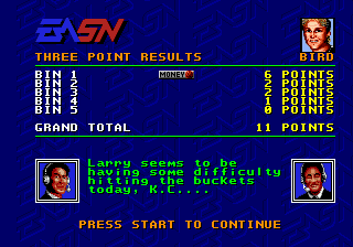 Passons. Toujours dans le menu, le concours à 3 points. Là encore, un grand choix, puisque le Grand Larry Bird peut concurrencer Larry Bird, et, vous ne me croirez jamais, Larry Bird. Mais ce dernier étant plus mauvais que les deux précédents à 3 points, il n'a aucune chance de remporter le concours. Alors c'est parti. 5 positions de tir, 5 ballons à chaque fois, le dernier comptant double. Que du bonheur!