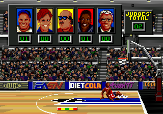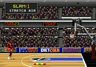 Ensuite le jeu en lui même. Exceptionnel! Au menu : un concours de dunks, où Jordan peut lutter seul, ou même contre Jordan, et, si vous aimez les challenges, contre Jordan. Vous choisissez votre dunk, puis vous vous élancez. Une flèche vous indique l'endroit du saut, et paf! vous écrasez un méga-pastos dunk. C'est énorme!