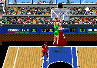A part ça... pas grand chose. Le mec nous contre des bras roulés comme il veut, les deux joueurs ont un premier pas encore plus lent que le mien (c'est dire), et le public est à chier. Aucune affiche genre « MJ on t'aime! », ou même « Bird petit zizi! Ta mère t'as chié » (merde à la censure) pour encourager, ou au contraire, envoyer se faire foutre les joueurs. Déplorable.