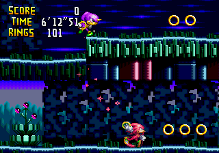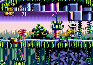 Une chose à noter, dans Knuckles' Chaotix, on a pas de vies. On a des anneaux que l'on ramasse. Lorsque l'on est bloqué on peut faire revenir son perso sur le même plan, mais on perd 10 rings (on peu donc avoir un nombre négatif de rings). Une collision avec un ennemi vous fera perdre vos anneaux... ou tuera votre équipier si vous êtes à court de ferraille. Vous vous retrouvez donc seul un moment, et si pendant ce laps de temps vous vous faites toucher, vous quittez immédiatement le niveau.