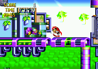 Mais Chaotix ne serait pas Chaotix sans sa façon de jouer. Aussi bien adapté à un seul qu'à deux joueurs, votre manière de jouer devra s'adapter en fonction de la nature de votre coéquipier (CPU ou humain) ainsi que de votre couple de perso. Et c'est une fois que vous avez le jeu bien en main (comptez une petite paire d'heures) que vous commencez vraiment à sentir la puissance du concept. L'utilisation du champs de force qui vous unit comme un élastique vous permet de prendre de la vitesse dans divers endroit ou d'utiliser l'effet balancier pour vous propulser littéralement a des hauteurs recelant des secrets. Bien sûr les bonus planqués dans des moniteurs sont aussi de la partie et pimenteront la traversée d'un niveau.