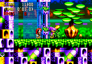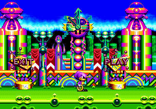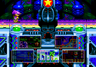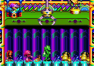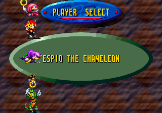 C'est ensuite que l'on rentre dans le vrai. Un premier écran nous demande de choisir notre personnage principal. Puis vient le Combi-Catcher. Une machine à laver qui vous permet de choisir de manière plus ou moins aléatoire votre second personnage. On distingue Knuckles l'échidné, Vector le Crocodile, Iighty le tatou (qui a déja fait une première apparition dans Segasonic sur arcade), Charmy Bee et enfin Espio le Caméléon. Vous vous le doutez, chaque personnage à ses propres caractéristiques: Knuckles plane et grimpe aux murs, CharmyBee sait voler et Espio marche sur toutes les surfaces, murs et plafonds notamment... Puis vous traversez un long couloir qui va choisir aléatoirement cette fois-ci un niveau parmi les 5 actes des 5 zones présentes dans le jeu.