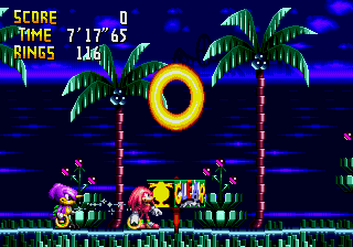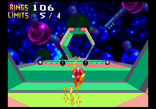 Enfin comme dans tout jeu Sonic qui se respecte 50 n'est pas un chiffre anodin, puisque lorsque pour passerez le SignPost de Fin de niveau, vous aurez la possibilité de sauter à la manière de Sonic 1 dans l'anneau du Special Stage. Special Stage tout en 3D qui vous permettra de récolter des Anneaux du Chaos. Le principe est un mélange de Sonic 2, Sonic 3 et Sonic CD. Vous dévalez un tobogan lequel est dépourvu de gravitation, et vous devez récupérer les sphères bleues qui sont dissimulées un peu partout. Si vous passez le checkpoint sans le nombre requis, vous recommencez en essayant de récupérer les sphères qu'il vous manque. Votre survie dans le niveau ne dépendant d'une chose: votre nombre d'anneaux. Ce nombre d'anneaux est rduit à chaque seconde où lorsque vous touchez une de ces boules a piques. Le nombre d'anneaux au départ correspond au nombre d'anneaux que vous aviez en quittant le niveau... Il est donc important d'en avoir des masses... surtout dans les Special Stage assez complexes. Ah oui et aussi surprenant que celà puisse paraître.... Aucune apparition de Sonic ou de Tails !?!?! Et bien non ils n'y sont pas. En revanche certaines rumeurs assez fondées circuleraient sur le fait qu'ils aient été prévus (et même présents sur les Roms de Bêta version) sur les premiers temps du développement.