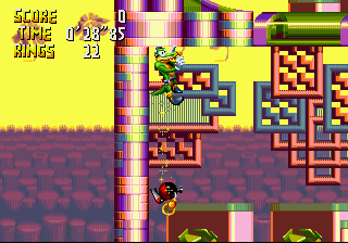 Passons maintenant au coté technique de cette perle. Oûtre le special stage qui fout une claque quand on connaît la console, je qualifierais le reste comme ceci: Beau. Un univers très coloré, extrêmement détaillé qui correspond et qui affiche sa parenté avec Sonic à 100%. Des niveaux énormes bourrés de planques alternant passages rapides et techniques. Une bande son hallucinante qui mixe une dizaine de synthés simultanément (du bonheur pour les oreilles). Et puis LA zone chiante (en l'occurence Amazing Area). Et oui chaque jeu a la sienne, et ici, c'est un dédale labyrinthique qui rappelle Labyrinth Zone sur Sonic 1 et Sandopolis 2 dans Sonic 3. Enfin pour finir le jeu avec tout comme il se doit, comptez pas moins de 10 heures voire plus si c'est votre première expérience de chaotix.