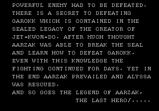 Pourtant, un combat sépare encore Gilbert – oui, j'en ai marre d'écrire Aarzak, c'est à chier ce prénom – d'Alyssa : le « Dernier Combat ». Après quoi, notre Vrai Héros découvrit le moyen de tuer Garokk, et sauva la jeune captive. Fin.